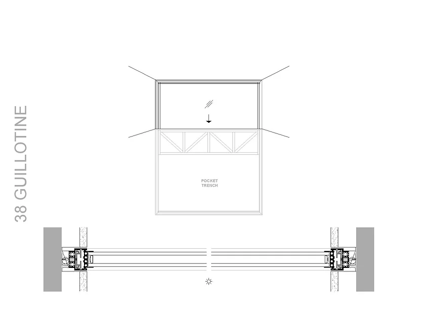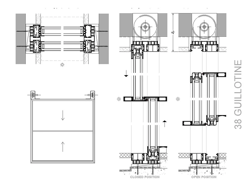 38 GUILLOTINE is OTIIMA’s vertical sliding window system that uses hidden counter-weights and pulleys to balance the mass of the operable panels. It is offered in one or more panels, one or more tracks and can be operated manually or motorized. Ascending or descending panels can be configured with fixed panels or vertical pocketing conditions.